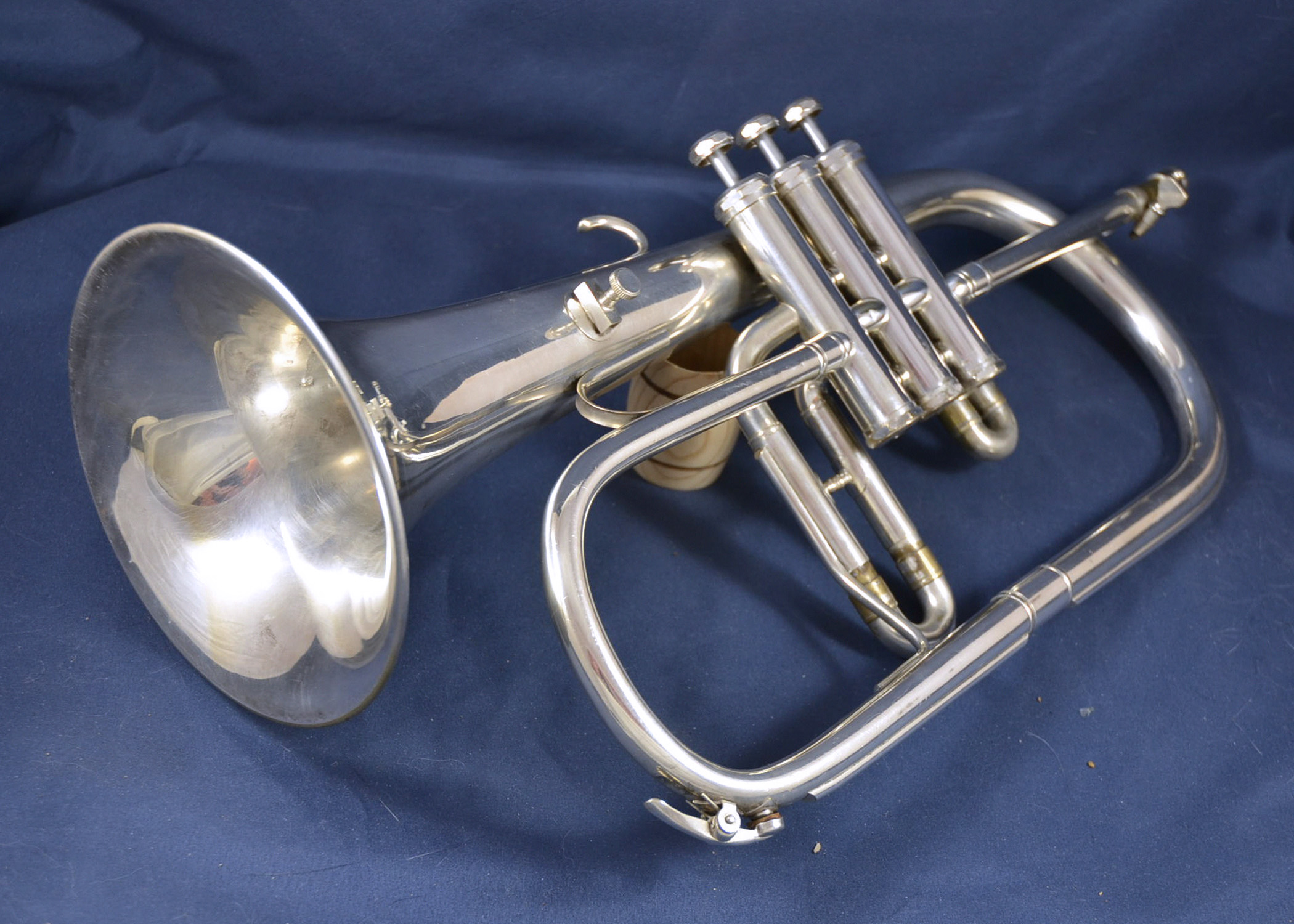 Här har vi ett typiskt franskt flygelhorn med klang någonstans mellan Couesnon (lättare klang) och Courtois (tätare klang). Det enda sättet att få veta detaljer säkert om det här hornet är nog att hitta någon som jobbat i butiken som sålde det, i Lyon. Lite väl mycket arbete, så håll till godo med några spekulationer i annonstexten, som ni som vanligt hittar genom att klicka på bilden.