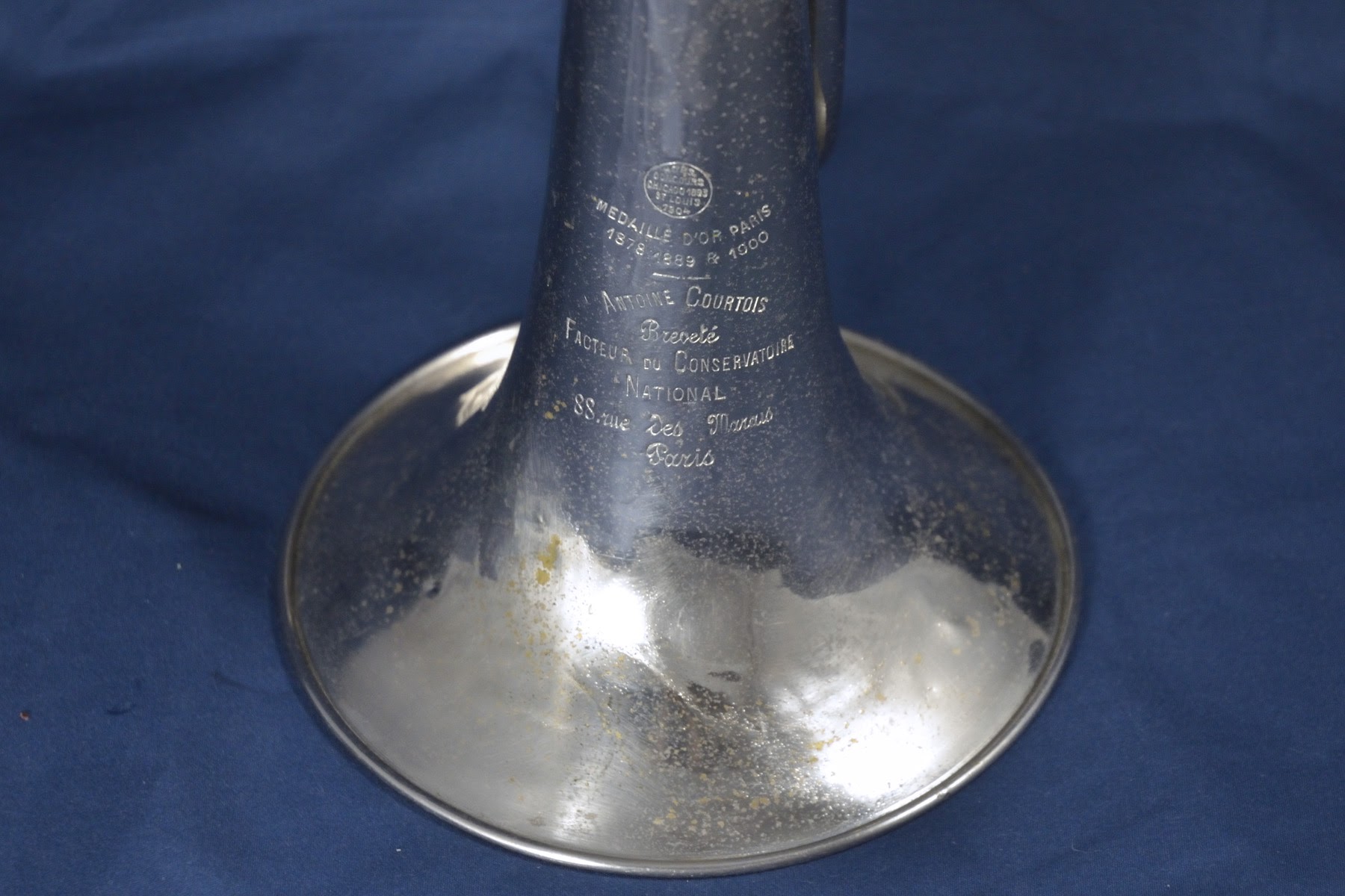 Ännu ett äldre franskt, flygelhorn. Jo, men det väl inte fel att ha två att välja på? Det här Courtois-flygelhornet är buckligare och säljs med en betydligt enklare väska än Andrieu-flygelhornet, men det är å andra sidan försilvrat och så är förstås Courtois en känd tillverkare av kvalitetsflygelhorn. Spelmässigt upplevs det här som lättare och ljusare i klangen.